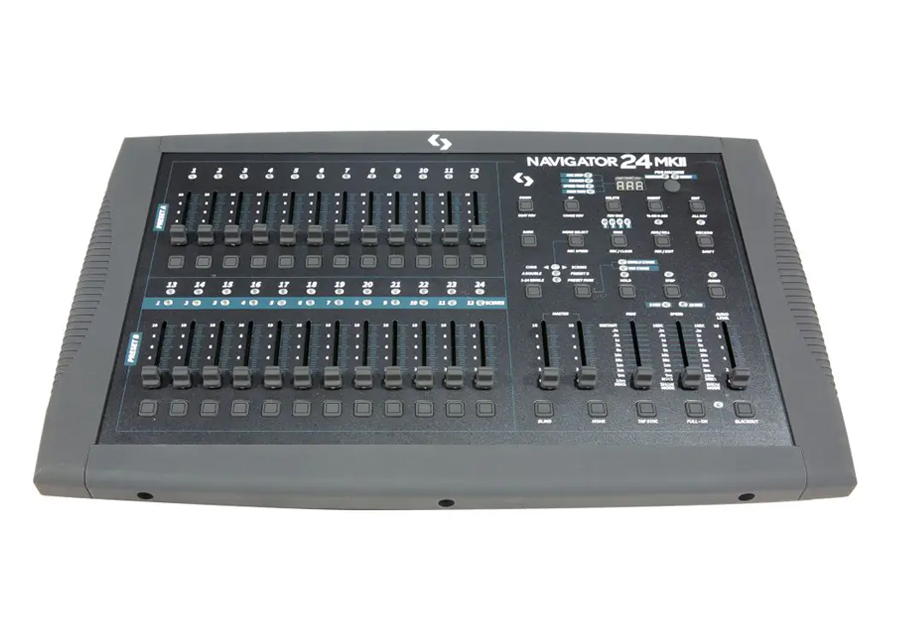 Navigator 24 MKII es una consola DMX para luces fijas de 24 canales, con 24 faders y una interfaz diseñada para darle dinamismo a la programación y reproducción. El controlador cuenta con 48 chases, 4580 escenas, un botón dedicado para la máquina de humo y una función para pasar a control manual un canal durante la ejecución del chase. Navigator 24 MKII es una consola ideal para aplicaciones móviles de pequeña y mediana escala, contando con variación de velocidad, tiempo de fade y dos master faders para controlar la salida general y el chase de forma separada.