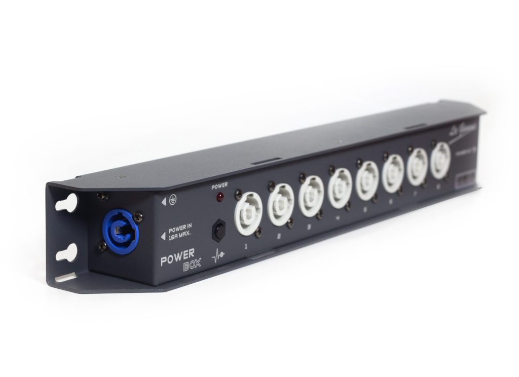 El Nuevo Power Box de LaGamme es liviano, compacto y resistente. Esta caja de distribución aerodinámica está hecha de aleación de aluminio, lo que la hace delgada pero de gran dureza. Power Box es una unidad de distribución de energía, la corriente de entrada máxima es de 16A. Hay un conector powerCON azul en el lado izquierdo de la unidad para la entrada de energía, ocho conectores powerCON blancos en la parte frontal para el suministro de energía a los otros dispositivos y un conector powerCON blanco en el lado derecho para el suministro de energía al siguiente Power Box.